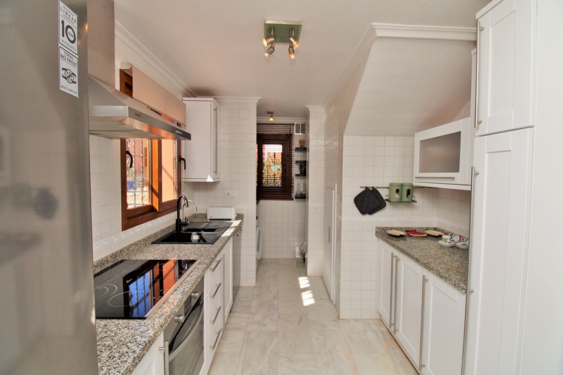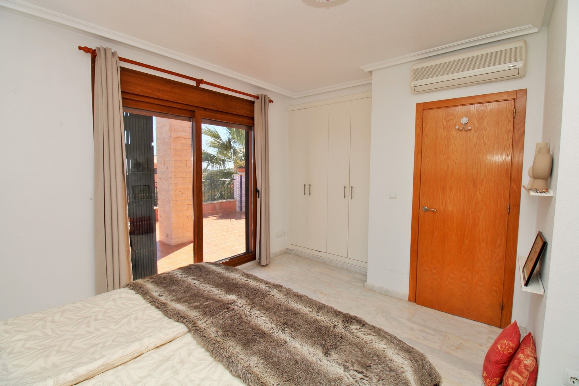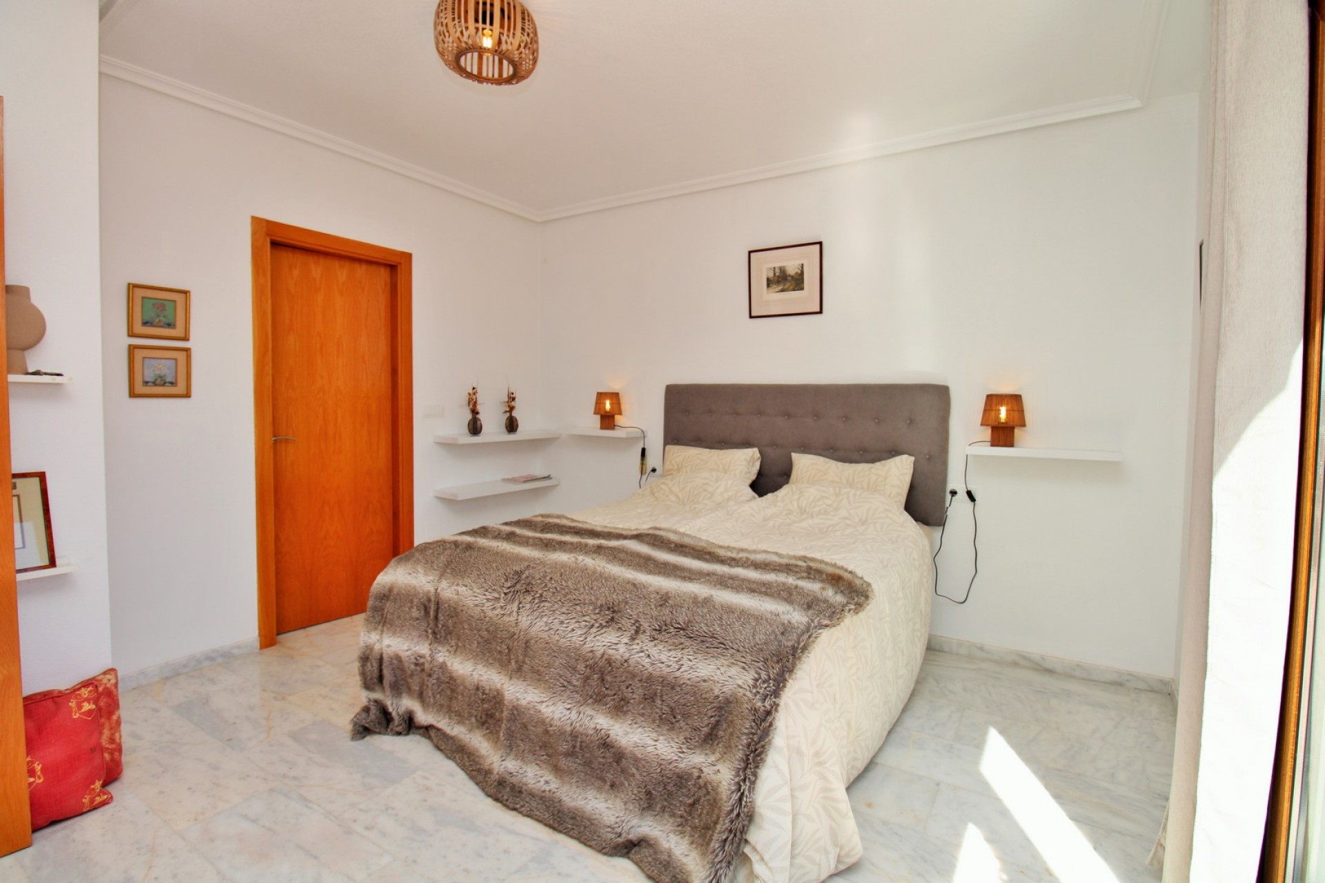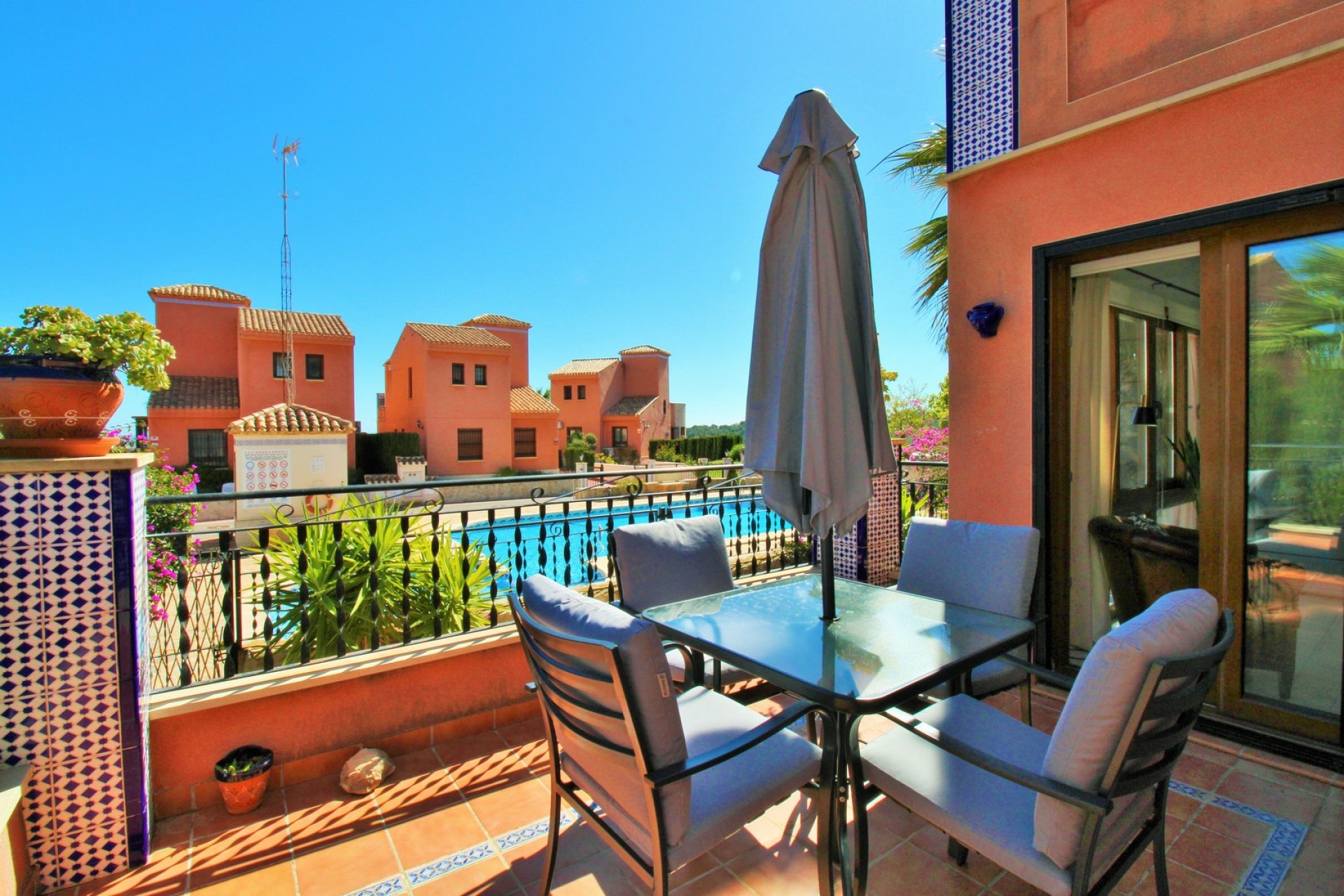 This exceptional 3 bedroom detached villa enjoys a privileged position directly facing the communal swimming pool within the prestigious gated community of La Cañada in San Miguel de Salinas. Offering beautiful Mediterranean sea views, peaceful surroundings, and a well-designed layout, the property perfectly combines comfort, privacy, and outdoor living. The villa sits on a private plot with a low-maintenance garden and direct access to the communal pool area, creating the ideal setting for relaxing in the sun or entertaining guests. The secure gated community also offers off-road parking, providing both convenience and peace of mind. Inside, the home is bright and well presented, featuring marble flooring throughout which adds a sense of quality and elegance. The ground floor comprises a spacious lounge and dining area with access to a raised terrace overlooking the pool, a fully fitted separate kitchen with utility area, two double bedrooms with fitted wardrobes, and a family bathroom with walk-in shower. Upstairs, the master bedroom suite offers a private retreat with fitted wardrobes, an en-suite bathroom, and direct access to a sunny roof solarium. From here you can enjoy panoramic views of the Mediterranean Sea, surrounding countryside, and Torrevieja’s famous salt lakes, making it the perfect space for sunbathing, relaxing, or enjoying warm Mediterranean evenings. La Cañada is a charming and well-maintained residential community known for its traditional Spanish style architecture, landscaped gardens, and tranquil atmosphere. Despite its peaceful setting, the property is just 3km from the centre of San Miguel de Salinas, with its restaurants, shops, and services. Villamartin Plaza and golf course are only a short drive away, while the beaches of Orihuela Costa can be reached in around 15 minutes. With its prime poolside position, sea views, and excellent location, this villa represents an ideal permanent residence, holiday home, or investment opportunity on the Costa Blanca. Viewings are highly recommended.