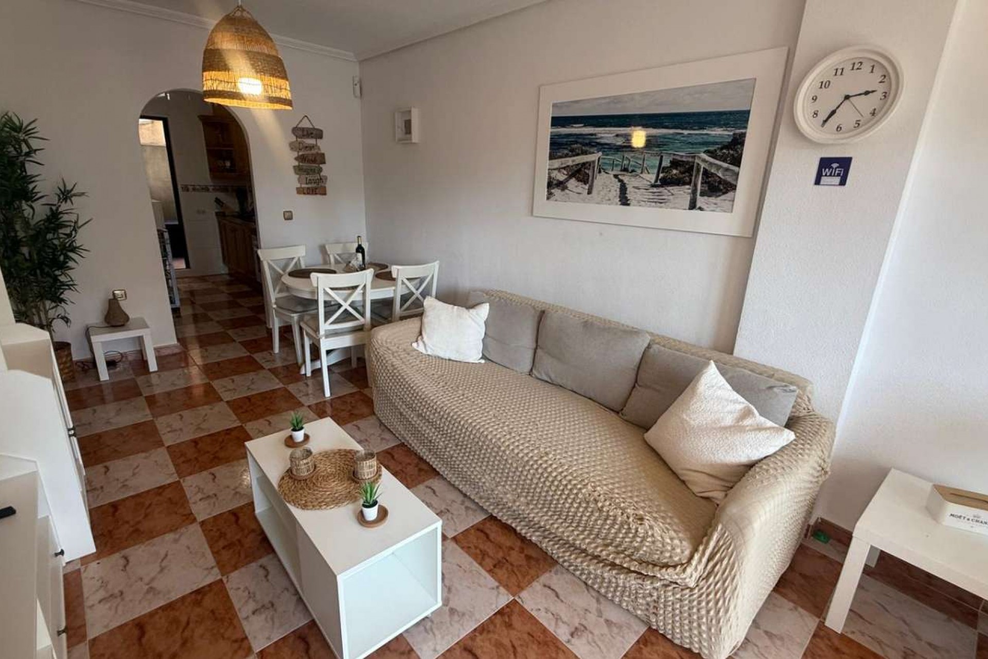 Ready to move in, this bright, south-facing apartment is ideal as a permanent residence, a second home, or an investment on the Costa Blanca South. Key features: • 2 bedrooms with en-suite bathrooms • Spacious and renovated living room (2023) • Separate kitchen • Fully furnished • Air conditioning and heating throughout • Modern style with Ibiza-inspired touches in the bedrooms Areas: • Living room + entrance hall: 19 m² • Kitchen: 6 m² • Bedroom 1: 14 m² + en-suite bathroom • Bedroom 2: 10 m² + en-suite bathroom • Patio: 4 m² • Terrace: 15 m² (south-facing) • Covered veranda: 10 m² (south-facing) Location and surroundings: Situated in a quiet residential complex with a year-round communal swimming pool, less than a 1-minute walk away. Perfect for enjoying golf and the Mediterranean lifestyle.