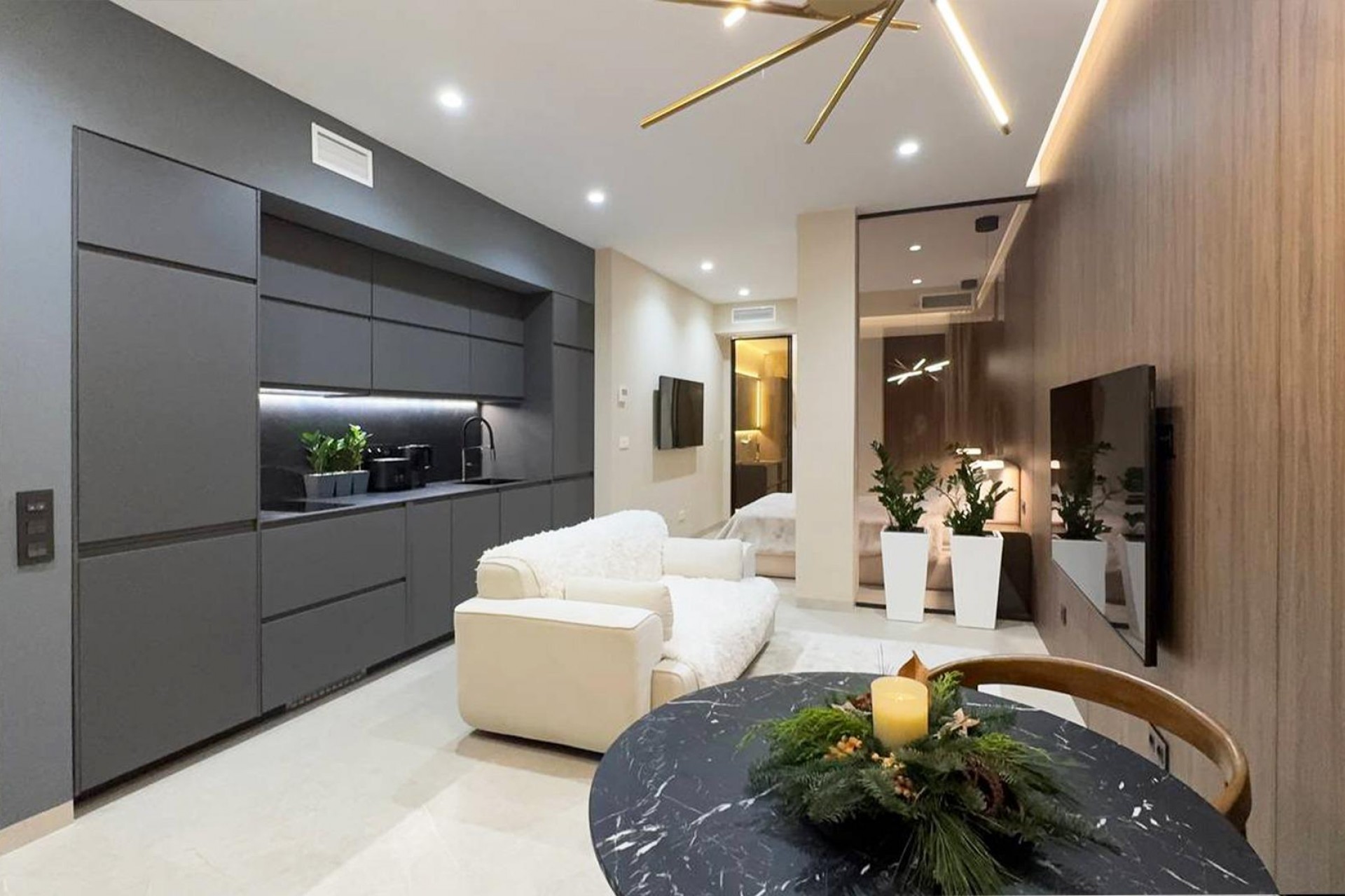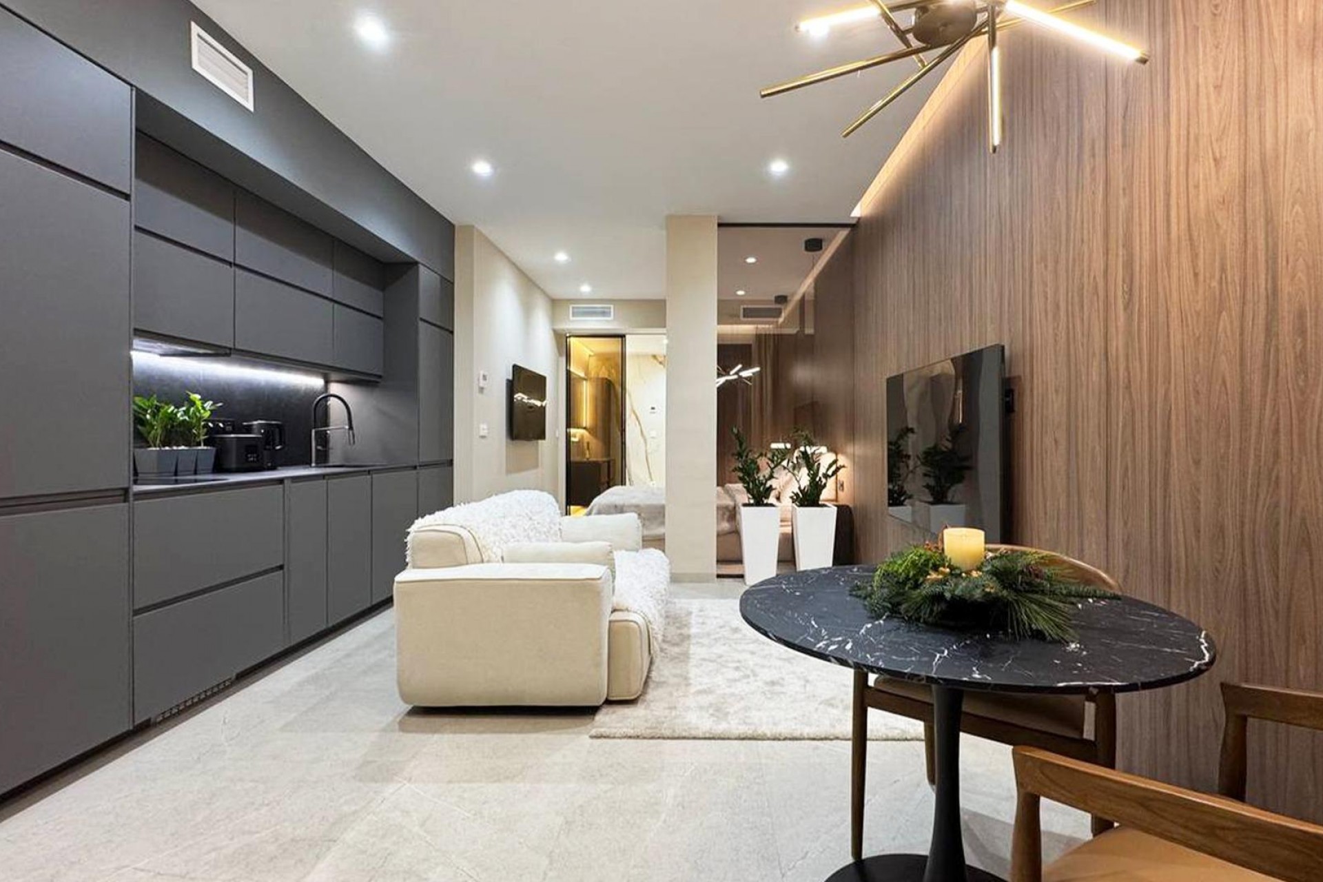 Elegante estudio de 44 m² en el corazón de Torrevieja, a solo 250 metros de la Playa de Los Locos. El apartamento ofrece un salón luminoso con ventanas panorámicas de suelo a techo, una cocina moderna totalmente equipada y un dormitorio cómodo con armario empotrado y acabados elegantes. El baño cuenta con ducha tipo lluvia, lavabo de piedra y suelo radiante. Control de climatización, iluminación LED y una terraza privada completan este sofisticado refugio mediterráneo, ideal como segunda residencia o vivienda permanente bajo el sol español.