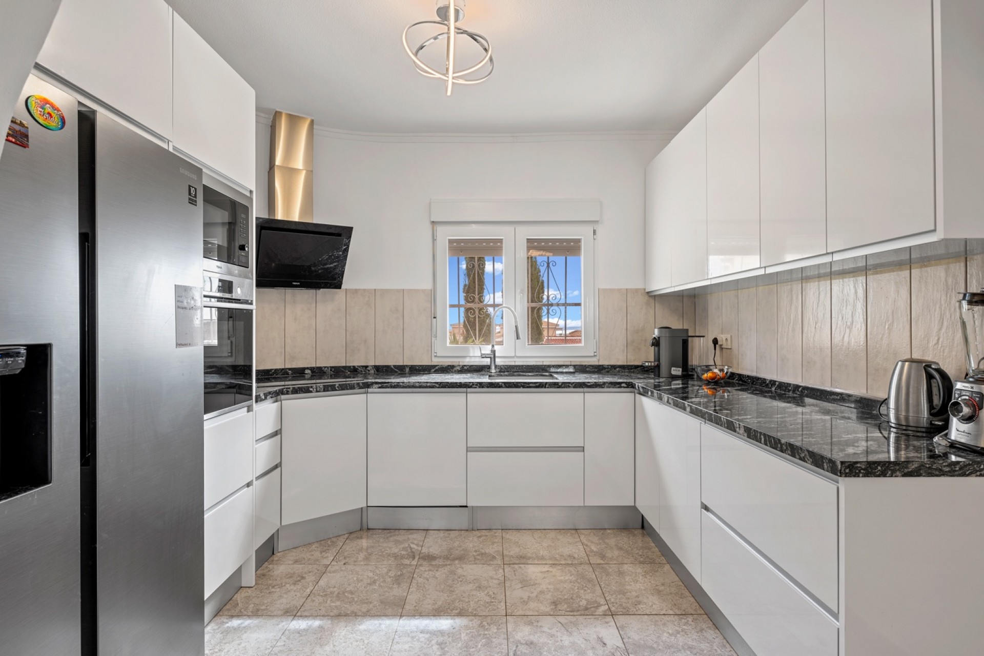 Belle villa rénovée de 5 chambres située sur un grand terrain orienté ouest dans le quartier recherché de Ciudad Quesada. La propriété offre 170 m² habitables et a été récemment rénovée. Le niveau principal comprend 5 chambres doubles et 2 salles de bains, dont une en suite dans la chambre principale. Toutes les chambres sauf une disposent de placards intégrés. Ce niveau comprend également un spacieux salon avec cheminée, une cuisine ouverte et une terrasse vitrée utilisée comme salle à manger et bureau. Le niveau inférieur dispose d'une salle de bains, buanderie et espace de rangement, avec accès indépendant depuis le jardin. Équipements : ClimatisationDouble vitrageCheminéePortail automatique Extérieur La villa se trouve sur un terrain de 1.069 m² orienté ouest. Le jardin comprend : Piscine privée avec espace détenteEspace repas couvert avec cuisine extérieure / BBQPlusieurs zones avec gazon artificielCarport pour une voiture