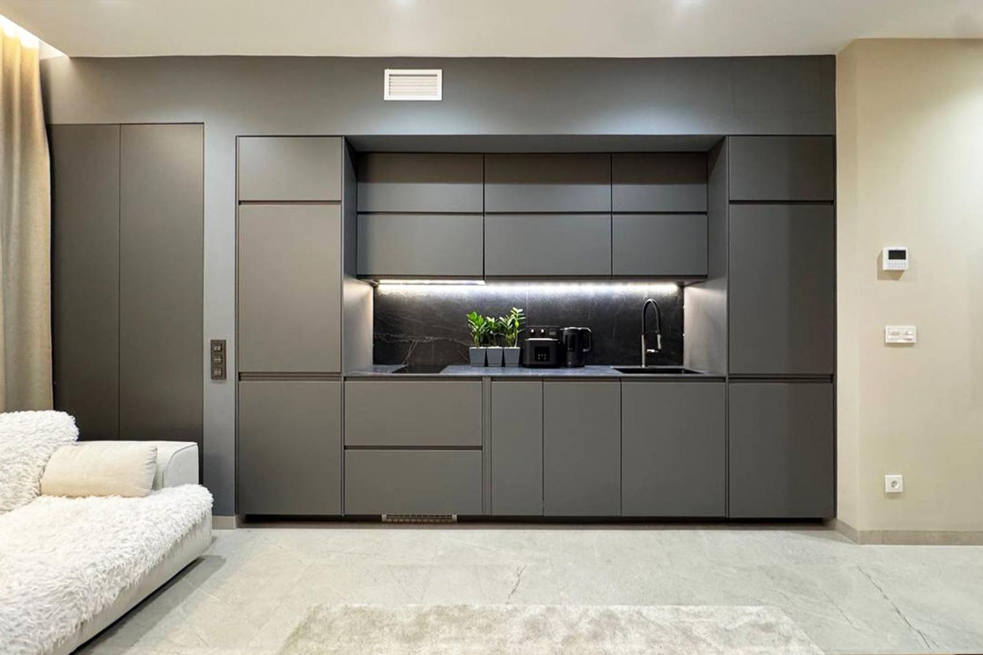 Studio élégant de 44 m² au cœur de Torrevieja, à seulement 250 mètres de la plage de Los Locos. L’appartement dispose d’un salon lumineux avec des fenêtres panoramiques du sol au plafond, d’une cuisine moderne entièrement équipée et d’une chambre confortable avec placard intégré et finitions élégantes. La salle de bain comprend une douche à effet pluie, un lavabo en pierre et un chauffage au sol. Climatisation, éclairage LED et terrasse privée complètent ce refuge méditerranéen sophistiqué – idéal comme résidence secondaire ou habitation permanente sous le soleil espagnol.